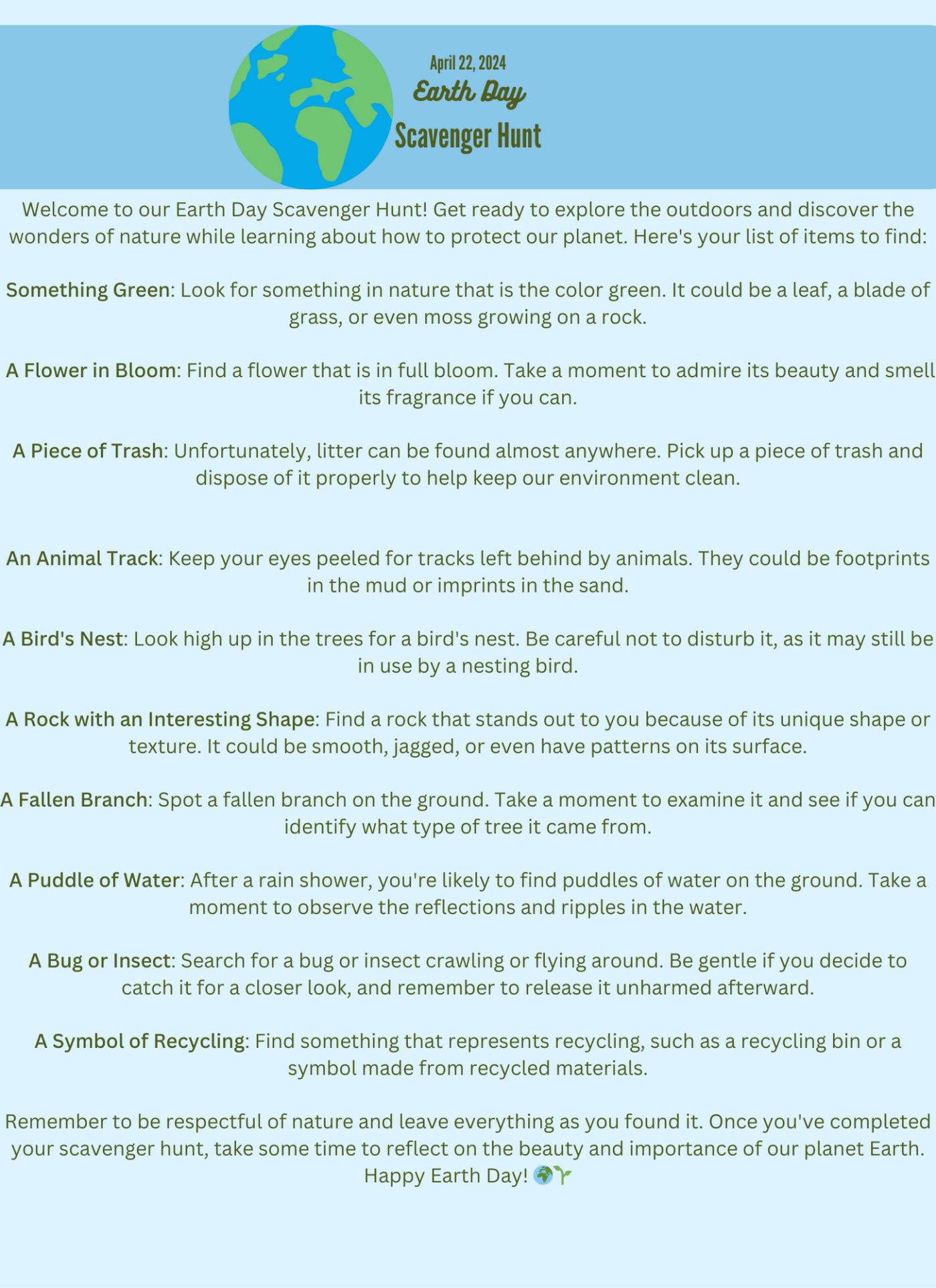 Energy Audit: Conduct an energy audit of your home to identify areas where you can conserve energy. Check for drafts around windows and doors, unplug electronics when they’re not in use, and switch to energy-efficient light bulbs. Challenge your family to reduce your household energy consumption and track your progress over time. Nature Art: Use natural materials like leaves, sticks, and rocks to create beautiful works of art. Arrange them into patterns or shapes on the ground, or use them to make sculptures and collages. Take photos of your creations before they’re reclaimed by nature. Composting: Start a compost bin in your backyard or even indoors using a small container. Collect food scraps like fruit and vegetable peels, coffee grounds, and eggshells, and layer them with brown materials like leaves or shredded paper. Over time, your compost will break down into nutrient-rich soil that you can use to fertilize your garden. Water Conservation Experiment: Explore the importance of water conservation by conducting a simple experiment. Fill two containers with the same amount of water and place one under a dripping faucet while covering the other. Measure how much water is collected over time to demonstrate the impact of small leaks and the benefits of fixing them. These hands-on activities are not only fun but also educational and meaningful ways to celebrate Earth Day and promote environmental stewardship. So roll up your sleeves and get ready to make a positive difference for our planet!
