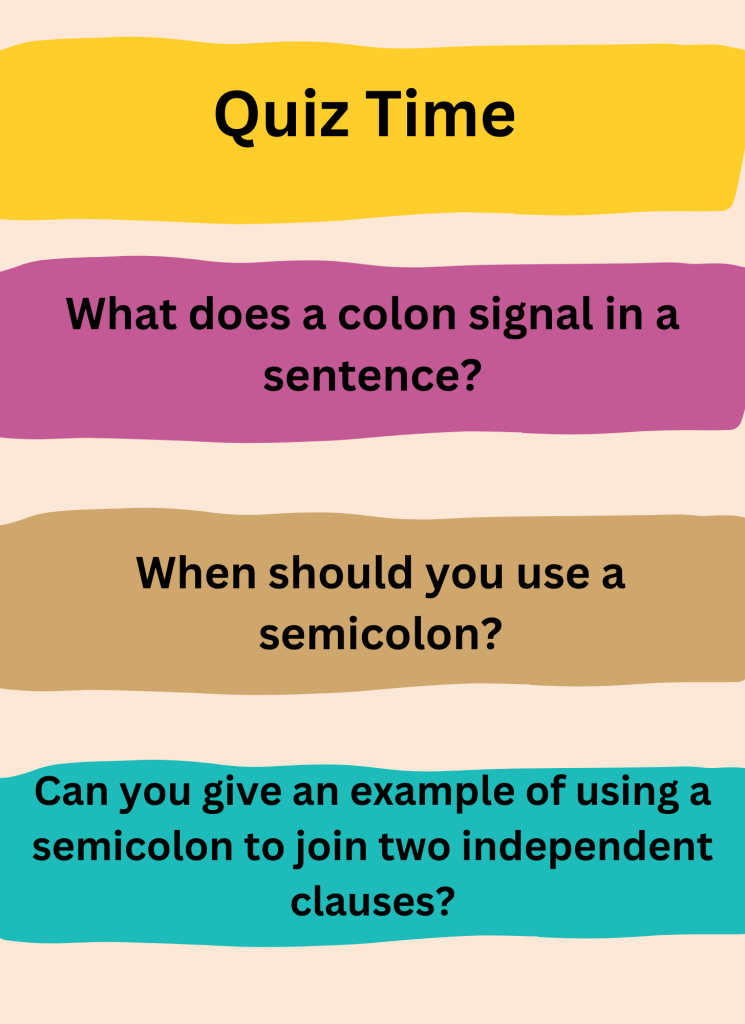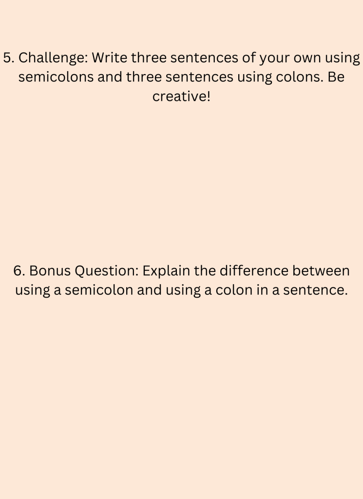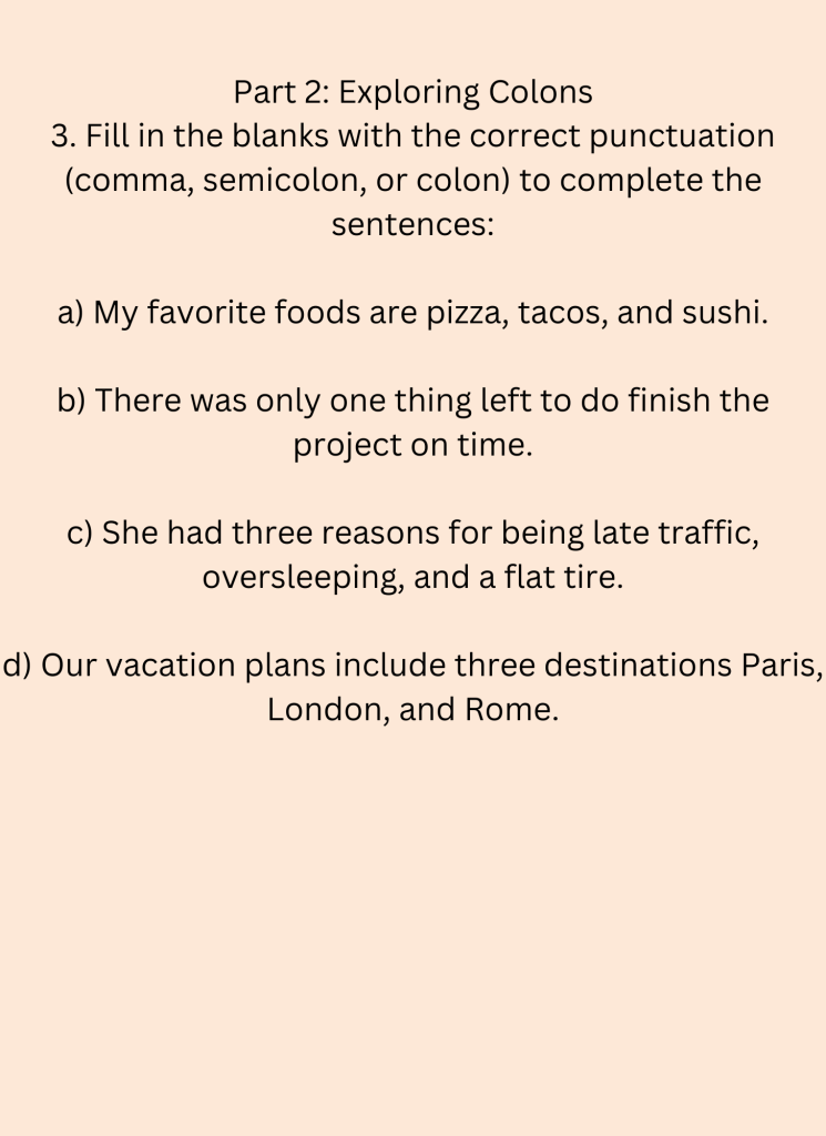 3. Fill in the blanks with the correct punctuation (comma, semicolon, or colon) to complete the sentences: