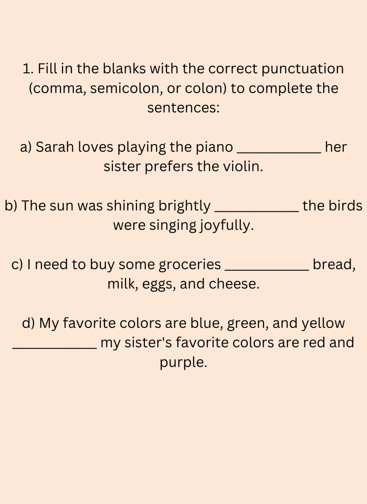 1. Fill in the blanks with the correct punctuation (comma, semicolon, or colon) to complete the sentences: