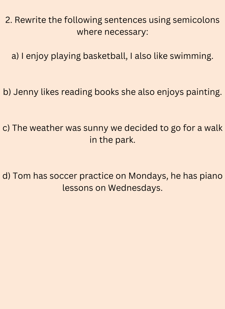 2. Rewrite the following sentences using semicolons where necessary: