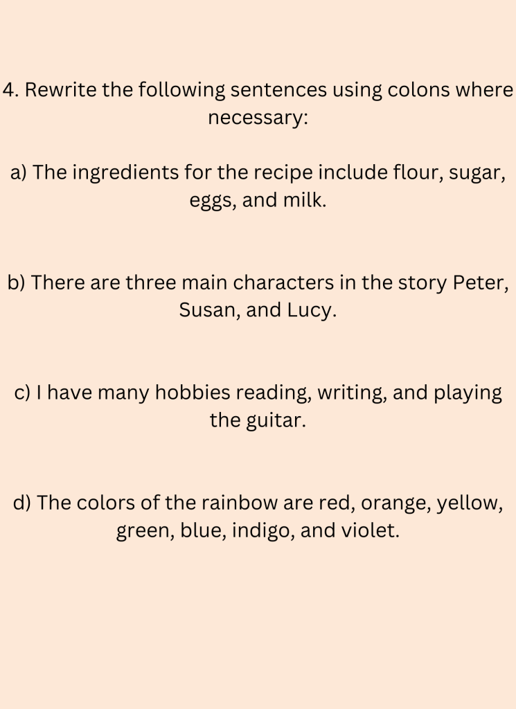 4. Rewrite the following sentences using colons where necessary: