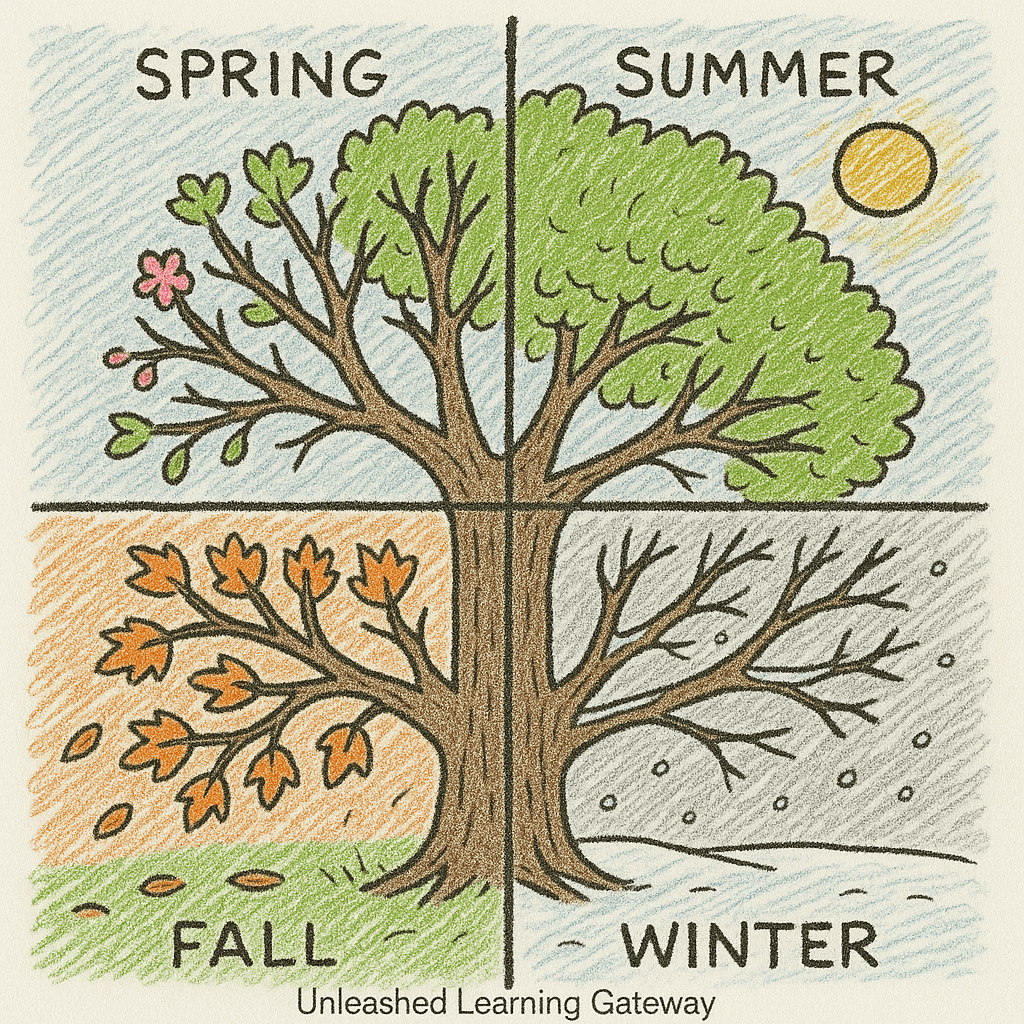 Students will illustrate and label how trees change through the four seasons — spring, summer, fall, and winter — to understand how plants adapt to seasonal patterns in nature.