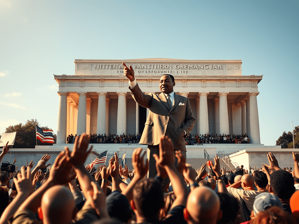 Dr. King traveled across the country giving speeches and organizing marches. He believed that change happened when ordinary people worked together. His most famous moment came in 1963 during the March on Washington, where more than 250,000 people gathered peacefully. Standing in front of the Lincoln Memorial, Dr. King delivered his legendary “I Have a Dream” speech. In it, he shared his dream of a nation where children would be judged by their character, not their skin color. Part of this speech was not written in his notes? A singer in the crowd called out, “Tell them about the dream,” and Dr. King began speaking from his heart.